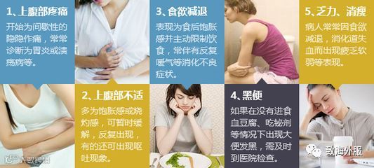 1、临床表现;凡40岁以上,不明原因的上腹部不适、隐痛、饱胀、恶心呕吐纳差、进行性消瘦贫血,或原有胃病史但症状改变或加重,应考虑胃癌可能。