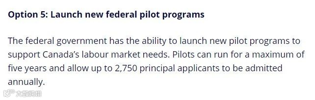 此外,联邦政府有能力启动新的试点计划,来支持加拿大的劳动力市场需求。试点计划最多可以运行5年,每年最多允许2750名主申请人获批。
