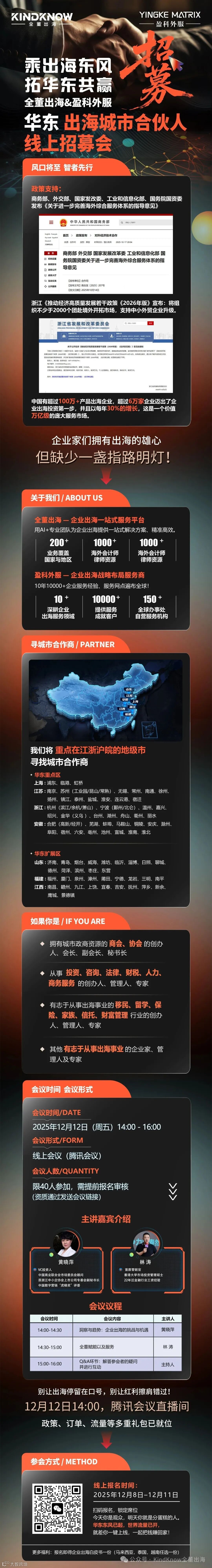 盈科外服当国家政策遇上万亿级出海市场,当专业平台遇上城市资源,会碰撞出怎样的财富新机遇?12月12日,全董出海&盈科外服华东出海城市合伙人线上招募会,为你解锁企业出海的新赛道!