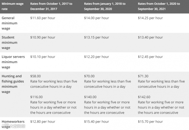 从10月1日起,全省的最低工资标准将从每小时14加元上调至14.25加元。学生的最低工资将从每小时13.15加元提高到13.40加元,酒类服务员的工资将从每小时12.20加元提高到12.45加元。新的涨幅将最少持续一年。