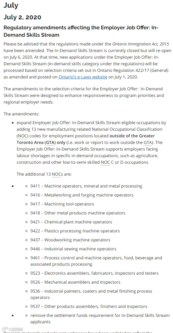 2020年7月2日,安省移民局官网消息,雇主担保紧缺职业类别将会在当地时间