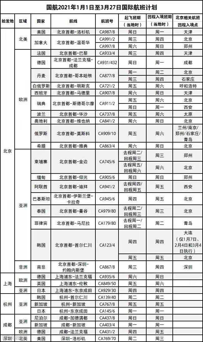 中国国航在2021年1月1日至3月27日期间,每周会执飞总计30条国际航线。