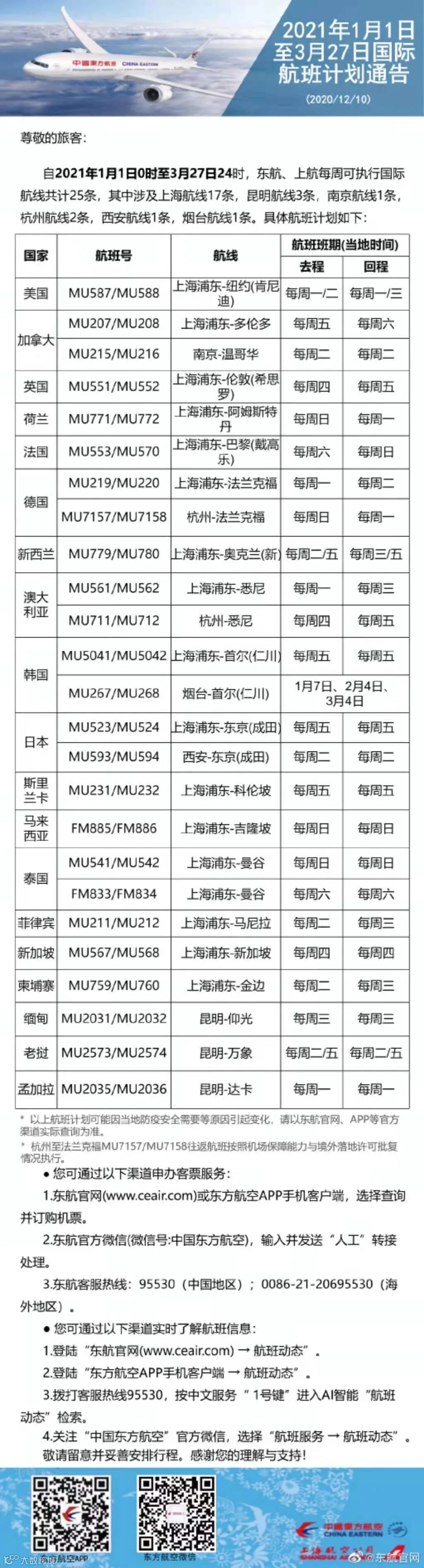 东航、上航在2021年1月1日至3月27日期间,每周会执飞总计25条国际航线。