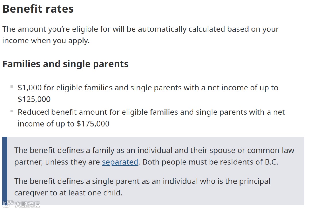 需注意,本福利金将“家庭”定义为个人及其配偶或同居伴侣。这两位家庭成员必须是BC省的居民。伴侣分居的情况不适用于这里对“家庭”的定义(分居的特殊情况下文会讲到)。