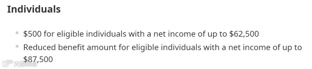 对于单身个人(Individuals)而言,年收入在62,500加元以下的单身人士可获500加元的免税福利金,而对于其他单身人士而言,该福利金会因为收入的上涨而逐渐递减,当单身人士的年收入在87,500加元以上时将无钱可领。