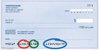 (红圈是银行账号的分行号,绿圈是银行机构编号,篮圈是账号 图自BC省政府官网)