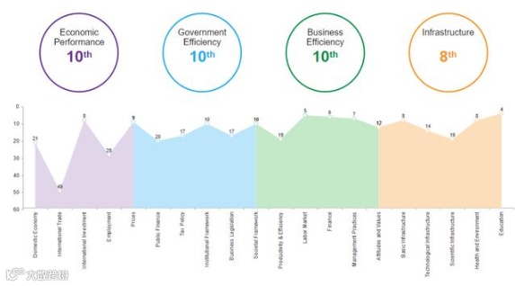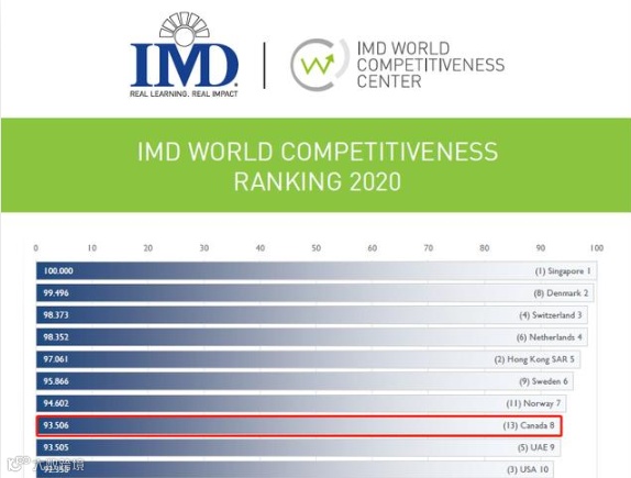 在IMD评选的全球63个国家或地区中,新加坡成功卫冕,连续第二年位居榜首。排在第二名的国家是丹麦,第三名为瑞士。中国香港特别行政区从去年的全球第二名下降到了第五名。美国从去年的全球第三名,下降到了全球第十名。惊喜的是,加拿大从去年的全球第十三位,上升到了全球第八名。