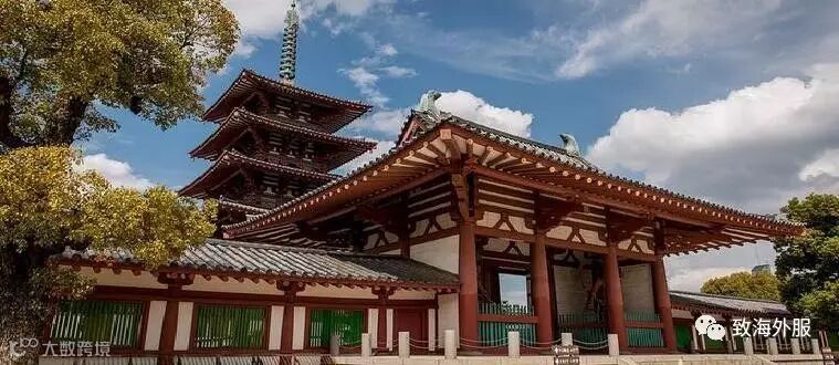 位于大阪南部地区,由日本历史上的文化英雄圣德太子建造,是日本最早受政府行政管辖的寺庙,被佛教徒们视为大阪的佛教祭坛,每年都有诸多活动在此举行。四天王寺为日本最古老的官寺,寺内的南大门、中门、五重塔、金堂、讲堂南北侧向一字排开,此即所谓的四天王寺样式,为日本最古老的样式之一,寺院中的堂宇于二次大战被空袭大火烧毁,而于1936年(昭和38年)才以钢筋重新建造。寺院的入口有好几个,除了1985年(昭和60年)重建的南大门以外,还有西门、中之门、东门,但从这一字并列的寺院配置看来,最好是从西门进入,西门(石鸟居)在1294年(永仁2年)建成,为日本最古老的石造明神鸟居(牌坊)。