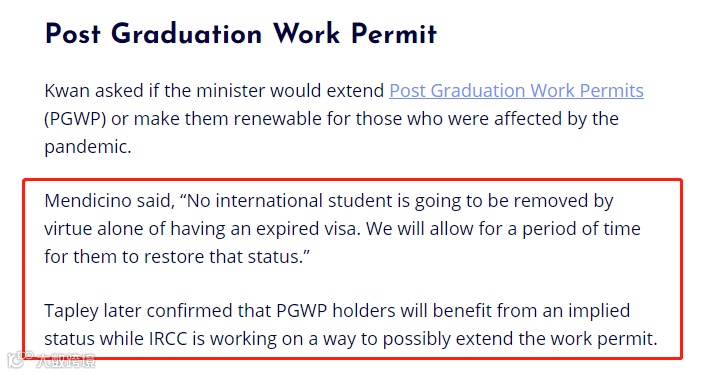 根据加拿大移民通讯社12月3日报道,加拿大移民部长Mendicino在一场移民委员的线上会议中正面回应了关于PGWP能否延期的问题。
