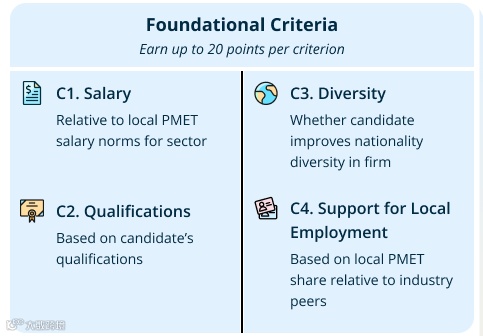 薪资评分标准是根据申请人和同行业同龄的专业人员、经理、行政人员和技术人员(以下简称PMET)的薪资作对比。