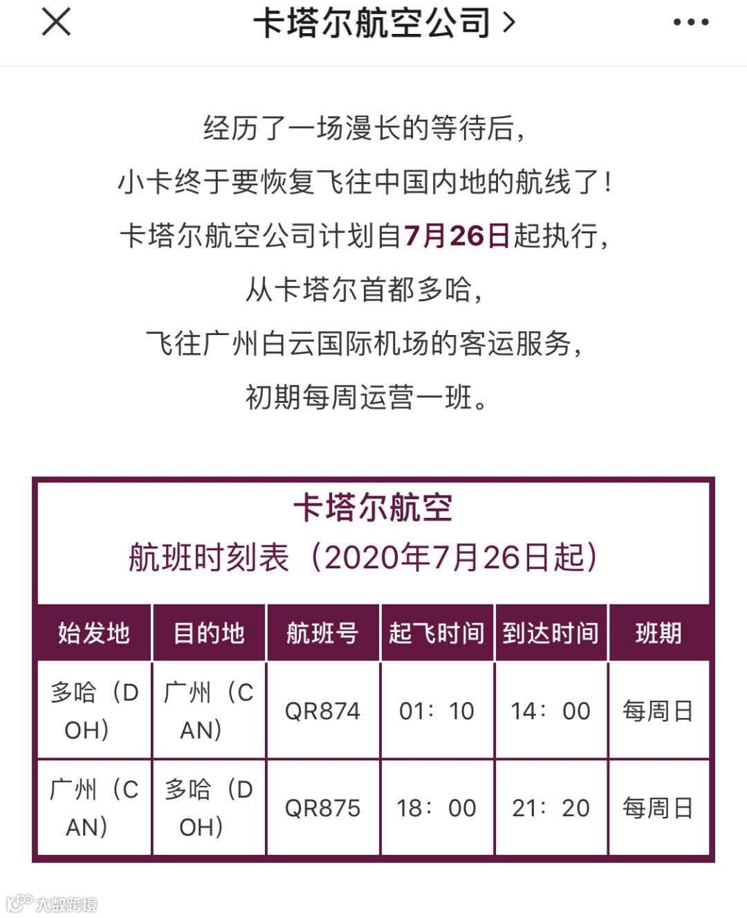 卡塔尔航空公司将从7月26日开始恢复多哈(DOH)-广州(CAN)航线,双向均为周日起飞。