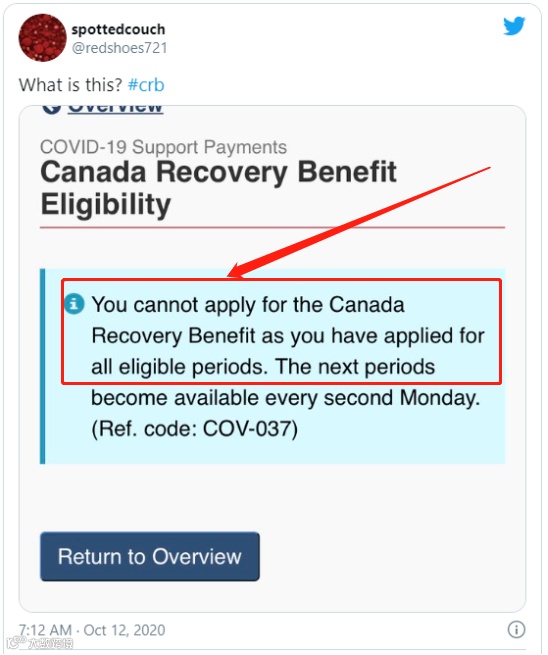 “由于您在可申请时段已经申请了所有符合条件的福利金,所以你现在无法申请加拿大复苏福利。”