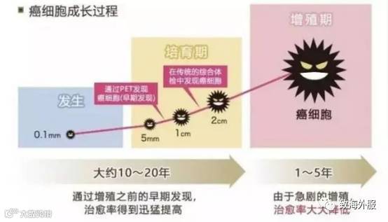 日本的癌症筛查最小可以发现5毫米以下的癌症,处于I期,这样的癌症通过简单的微创手术就可治愈,如果注意改善生活方式的话,一般不会复发。拥有治愈率高、副作用小、复发率小三大特点。在中国,通过仪器可以发现的,大概是几厘米以上的中晚期癌细胞。