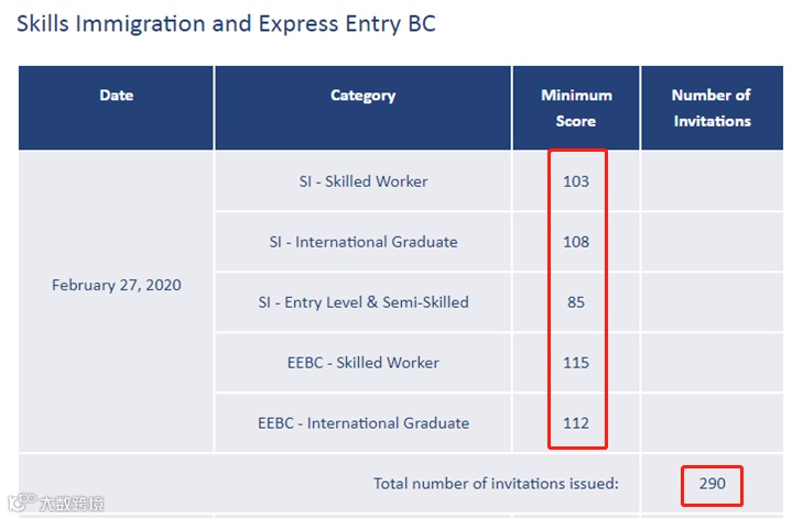 加拿大当地时间2月27日,BCPNP公布了最新一次抽签情况。时隔一个月之后的筛选,除低技术类分数与前两轮持平,其余均有上涨,共发出290份邀请。