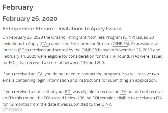 加拿大当地时间2020年2月26日, 安省移民局公布了最新一轮企业家移民抽分情况: