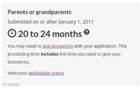 父母/祖父母团聚需要20至24个月;夫妻团聚(配偶居住在加拿大境内)需要12个月;夫妻团聚(配偶居住在加拿大境外)需要12个月。和一个月前相比,这几类申请的处理时间均无变化。