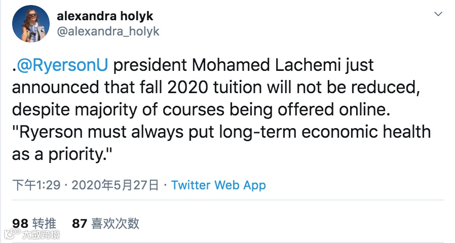 多伦多大学的学生在其请愿书中写道:基本课程都在网上,学校所有设施关闭,运营的成本大大降低,这正是一个理想的时期为支持国际学生而减少/免除部分学杂费。