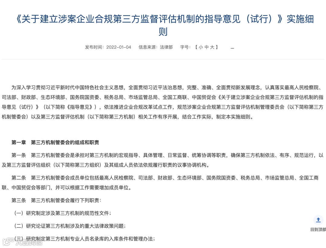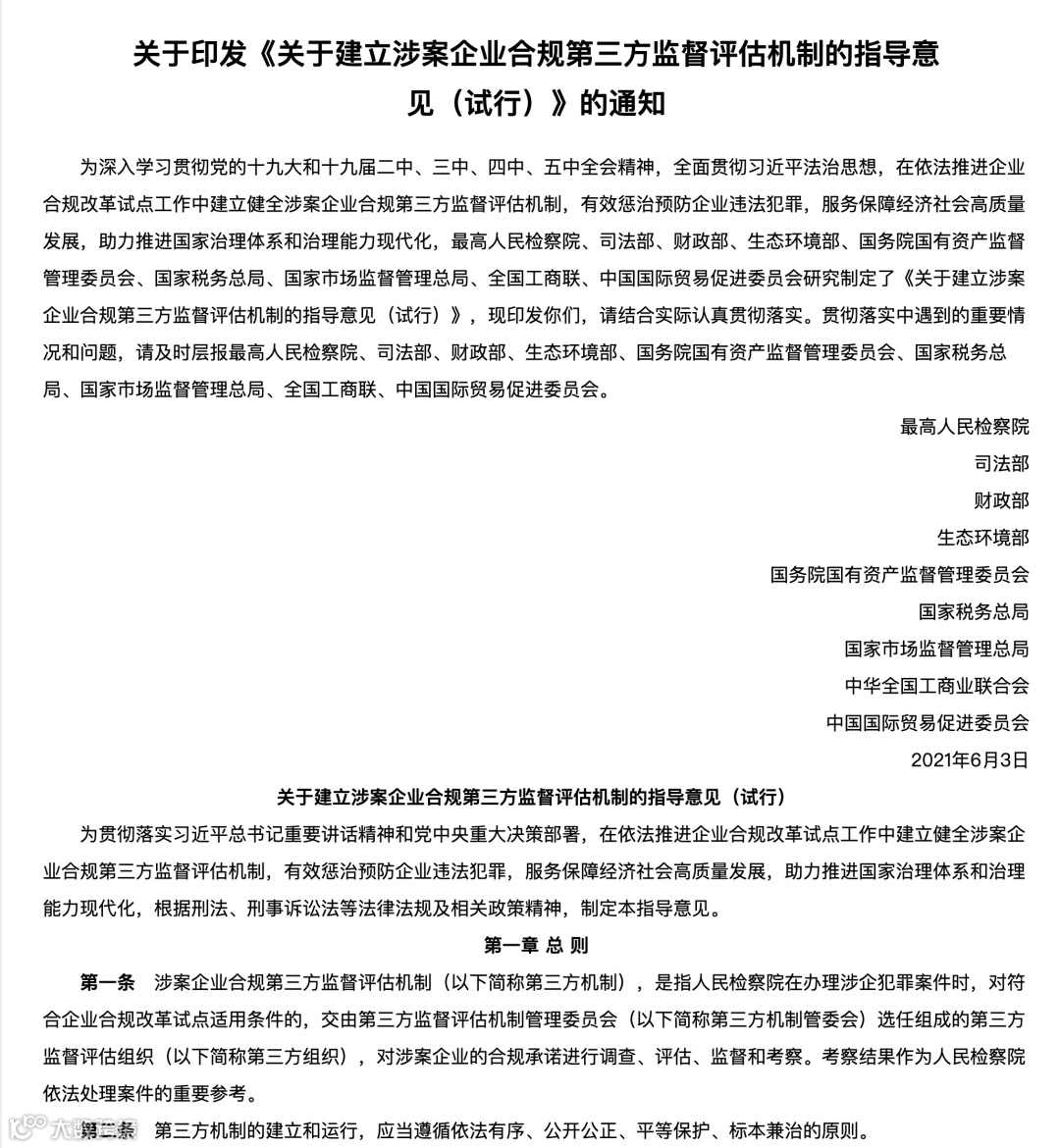 2021年6月3日,依法推进企业合规改革试点工作中建立健全涉案企业合规第三方监督评估机制,有效惩治预防企业违法犯罪,服务保障经济社会高质量发展,助力推进国家治理体系和治理能力现代化,最高人民检察院、司法部、财政部、生态环境部、国务院国有资产监督管理委员会、国家税务总局、国家市场监督管理总局、全国工商联、中国国际贸易促进委员会研究制定了《关于建立涉案企业合规第三方监督评估机制的指导意见(试行)》。