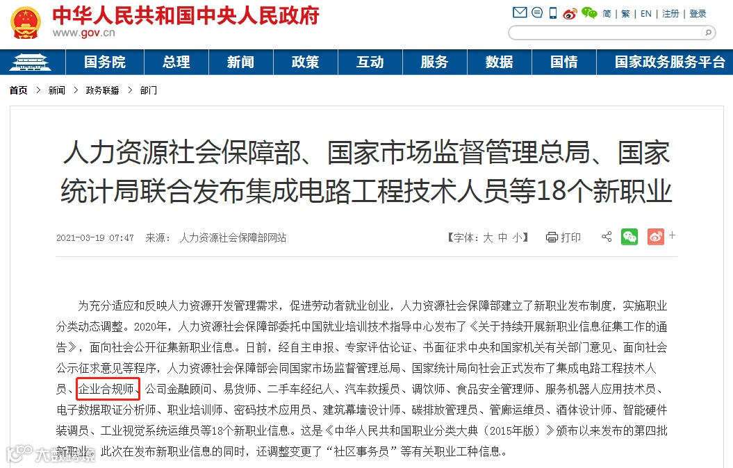 因此,在2021年3月18日,经中国贸促会商事法律服务中心申报,人力资源社会保障部会同国家市场监督管理总局、国家统计局正式将企业合规师纳入《中华人民共和国职业分类大典》,在《中华人民共和国职业分类大典》中归类为第二大类——专业技术人员,同会计师、税务师、审计师、经济师、工程师、律师等同类别。因此,意味着企业合规师正式成为律师、会计师、审计师之后,又一个得到国家认可的职业,成为职业选择中的新风口。