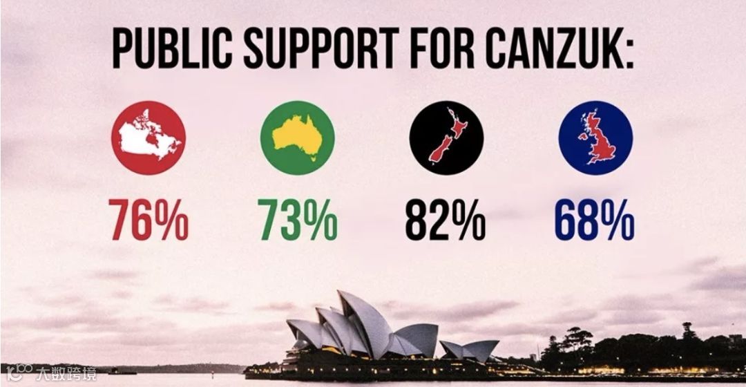 CANZUK2018年4月发布的4国最新民意调查结果显示,加拿大支持率为76%、新西兰支持率为82%、澳大利亚支持率为73%、英国的则为68%。