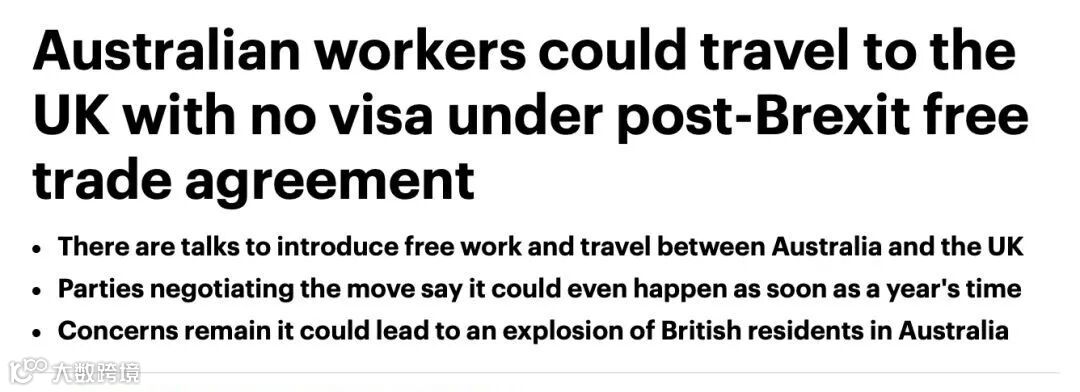 12月16日,英国每日邮报发报道标题为:在脱欧后的英澳自贸协议下,澳大利亚人不需要签证就可以来英国工作