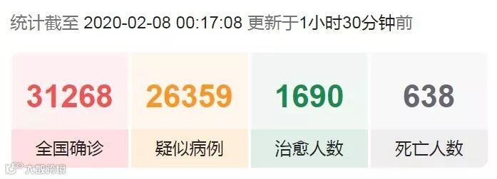 根据中国国家及各地卫健委每日信息发布,截至当地时间2月8日凌晨,中国已经有31,268例确诊病例,死亡人数为638人。