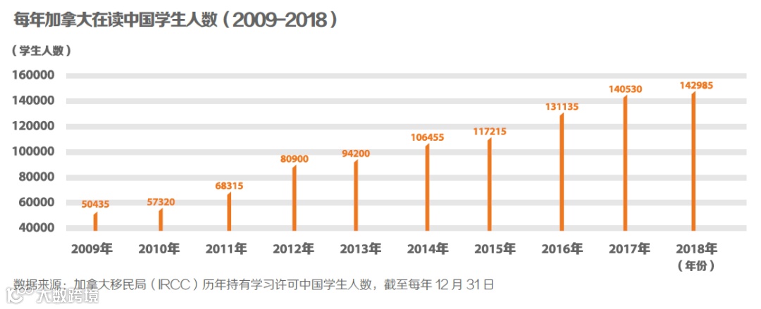 2018 年共有14.3 万中国学生在加拿大留学,约占加拿大所有国际学生的1/4。十年间,在加拿大学习的中国学生人数不断攀升,从5 万人增长至14.3 万人,增长率达184%。