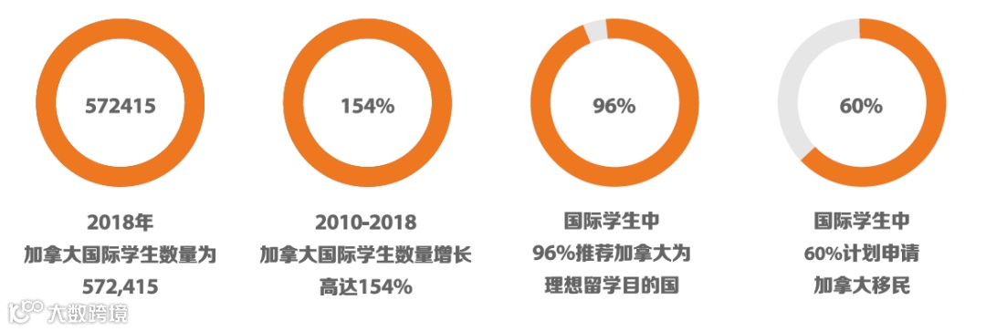 根据CBIE官方数据,2018 年加拿大国际学生数量高达572,415 人,2010 年至2018年加拿大国际学生数量增长高达154%,96%的国际学生推荐加拿大为“理想留学目的国”,60% 的国际学生计划申请加拿大移民。