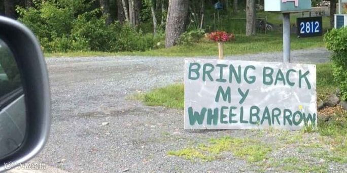 事情是这样的,这位网友在驾车经过一处民宅时,看见这家主人在门口立了一块牌子,上面写着“把我的手推车还给我”。