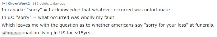 在加拿大:“Sorry”= 我抱歉这件不幸的事情发生了;在美国:“Sorry”= 对不起是我的错。