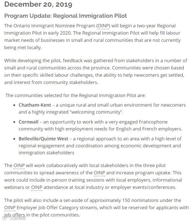 这个为期2年的试点计划将从2020年初开始时实行,从省提名计划类别中,分配150个名额指定给安省的Chatham-Kent, Cornwall 和 Belleville/Quinte West三个小镇。