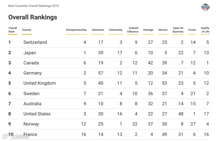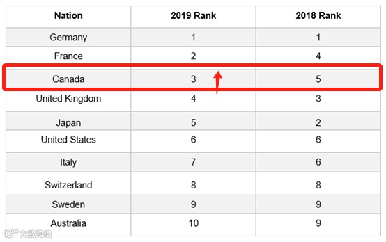 根据U.S.News&World Report此前发布的数据报告《2019全球最佳国家》显示,加拿大是仅次于瑞士和日本,排名第三的最佳国家。