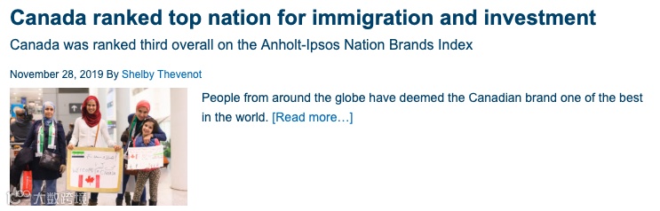 其实加拿大不仅在Anholt-Ipsos国家品牌指数排名榜上名列前茅,在其他调查数据中,也是非常值得骄傲的。