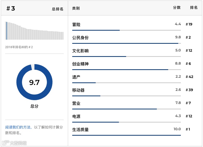 据CIC NEWS的报道称,2019年Anholt-Ipsos国家品牌指数排名,基于在20个国家及地区对18岁以上成年人进行的20,035个在线访谈,综合出口、文化、旅游、移民和投资、人口、治理等六个方面的因素,对全球50个国家进行评估,覆盖北美、欧洲、亚洲、拉丁美洲、非洲,可以说是相当公平公正。