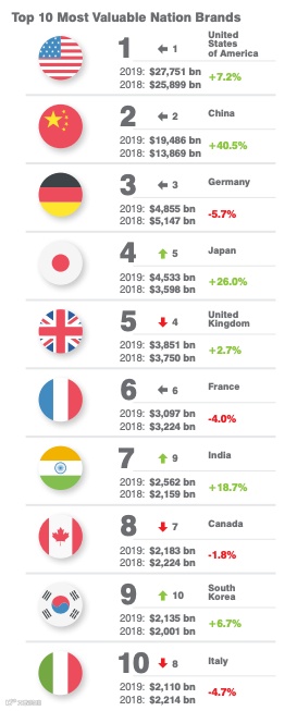 自2011年以来,英国每年排名第三,但现在跌至第四位。日本在2018年排名第二,但现在排名第五。美国仍然排在第六位。虽然意大利在2018年与美国并列,但现在排名第七。排名8-10的分别是瑞士、瑞典和澳大利亚。
