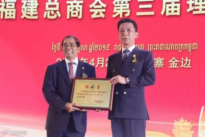 柬埔寨福建总商会为新一届理(监)事会领导班子颁发了荣誉聘书。施恭旗先生、潘苏萨阁下当选为永远名誉会长,黄美芬女士、李敏先生、黄锦同先生、王家仁先生、汤国旗先生、庄其铮先生当选为名誉会长,杨宗霖勋爵、胡健安将军当选为最高荣誉顾问,邱国兴先生当选为会长、许天山先生当选为监事长,黄可锦先生当选为执行会长,林志生先生当选为秘书长,陈文生先生当选为财务总监。