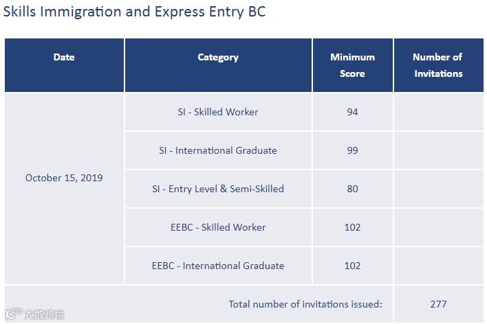 导读:加拿大当地时间2019年10月15日,BCPNP官网公布新一轮技术移民抽选情况,此次邀请人数277人。其中,