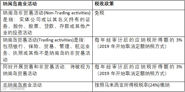 下表汇总了纳闽岛商业活动及其税收政策: