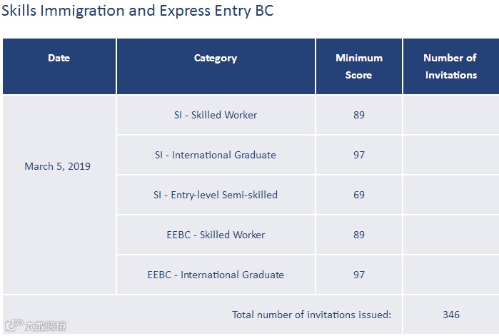 加拿大当地时间2019年3月5日,BCPNP官网公布新一轮技术移民抽选情况,此次邀请人数346人,所有类别邀请分数比上一轮都有所上涨。