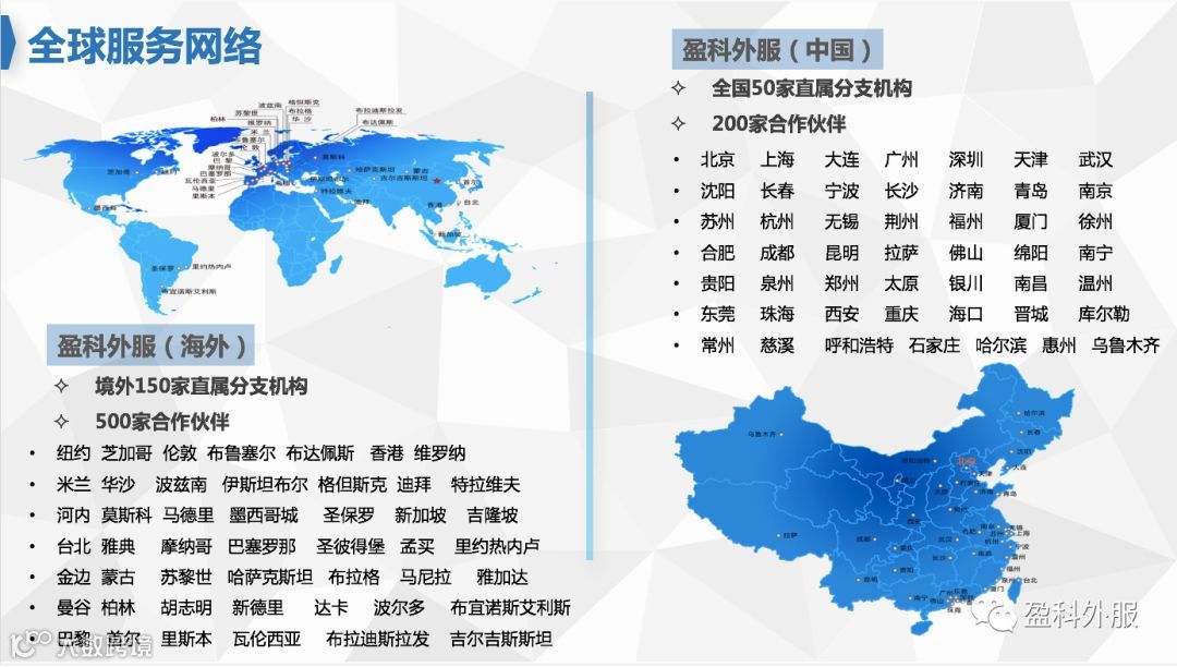 盈科外服总部位于上海,在中国50个主要城市拥有分支结构,并在包括英国、美国、法国、意大利、迪拜、新加坡、香港、印度、泰国、印尼等世界各地拥有超过150个分支机构与服务网点。盈科外服的客户不仅包括行业巨头、跨国公司,还包括中小企业、政府机构以及各类商协会。覆盖全球的服务网络,极为广泛的中外客户资源,以及高度国际化的专业团队,使得盈科外服在跨国直接投资服务领域拥有明显的优势。