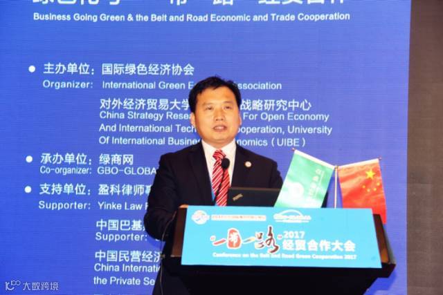 2017年5月29日,2017“一带一路”经贸合作大会在国家会议中心隆重召开,大会以“绿色化与‘一带一路’经贸合作”为主题,由国际绿色经济协会与对外经济贸易大学联合主办,绿商网承办,盈科律师事务所、中国巴基斯坦友好协会、中国民营经济国际合作商会、国家信息中心战略性新兴产业国际发展研究中心等单位支持。
