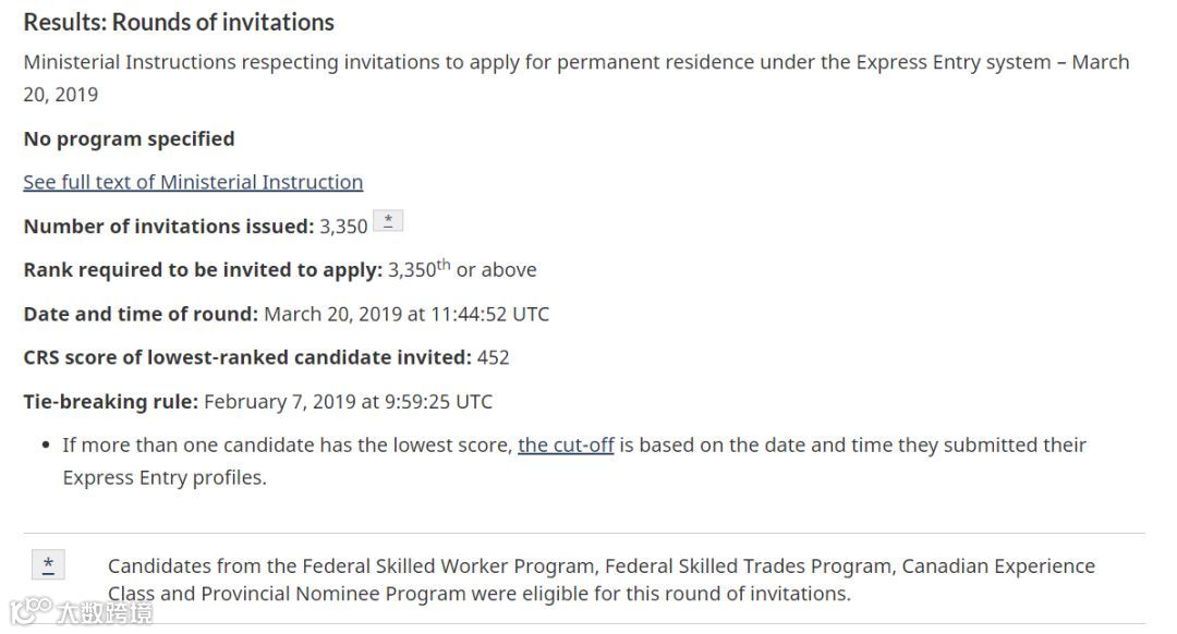 2019年3月20日加拿大移民快速通道 Express Entry 2019年第6次甄选。 本次甄选共计发出3350份邀请函(ITA), 甄选分数为452分,分数较再次稍稍降低。
