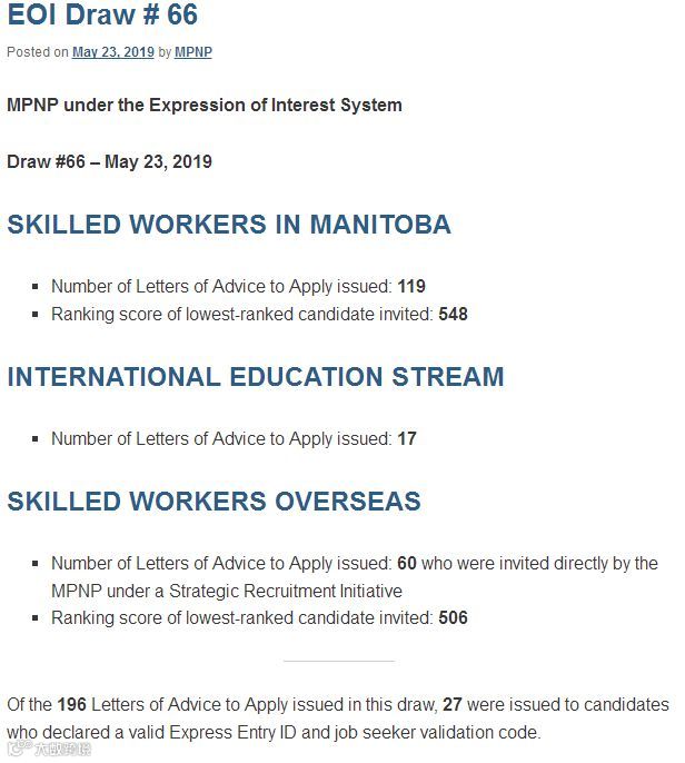 加拿大当地时间2019年5月23日,曼省移民局公布第66轮EOI抽选结果: