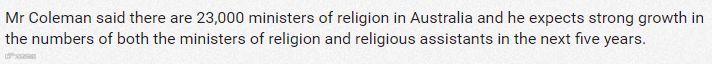 目前,澳州境内拥有23000名宗教工作者,作为移民国家,澳洲有着很多宗教信仰,对宗教人士的需求极大,所以未来一段时期,宗教人士的数量还会有明显增长。
