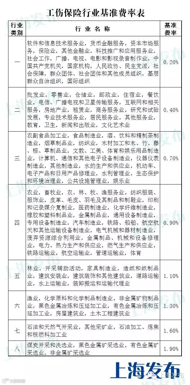 答:本市一类至八类行业用人单位基准费率按照全国工伤保险行业基准费率规定执行,即分别为该行业用人单位工伤保险缴费基数的0.2%、0.4%、0.7%、0.9%、1.1%、1.3%、1.6%、1.9%,并按照“以支定收、收支平衡”的原则适时调整。