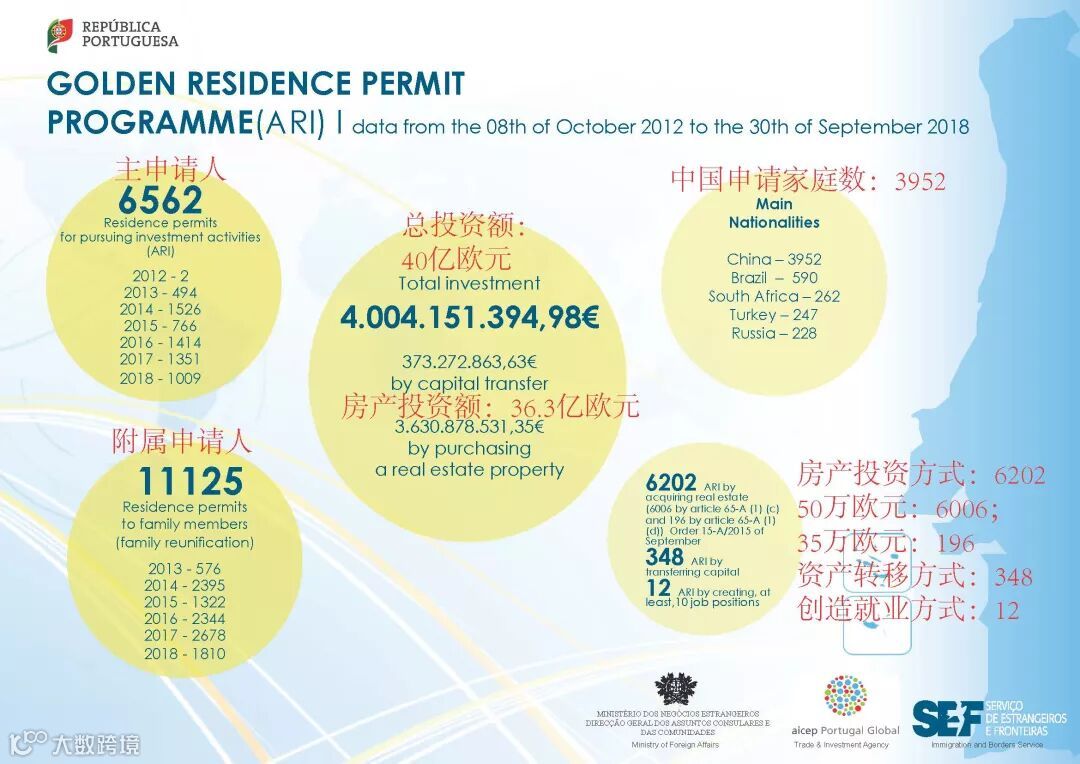 葡萄牙黄金居留许可计划(Golden Visa)截至9月底的大数据显示,该政策已经累计为葡萄牙政府吸引超过40亿欧元的投资资金,有超过6500个家庭通过该计划获得了身份,家庭成员的获批人数超过11000人。
