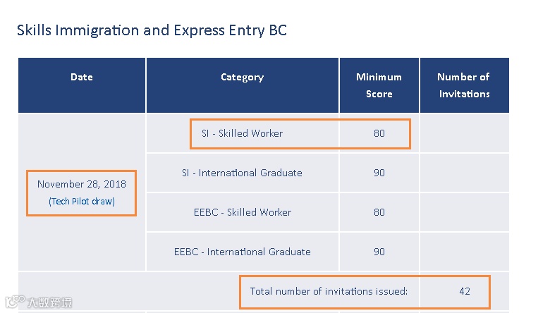 加拿大当地时间2018年11月28日,BC省移民局公布新一轮技术移民 (仅针对29个特快审批职业) 抽选结果:本轮抽选共计发出42份邀请, 常规雇主担保类项目抽选分数线维持80分, 其它类别分数线也与上一轮基本持平。