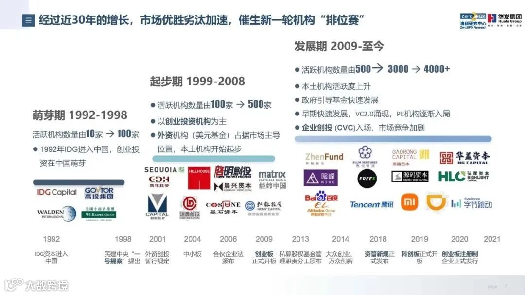 第一个阶段是萌芽期,1992-1998年。那时候投资非常不活跃,甚至基本上没有,所以萌芽期主要的参与者是IDG资本、华登国际,他们是中国最早传播创投的播种者,今天他们依旧活跃在这个市场,继续支持中国的科技产业的发展。