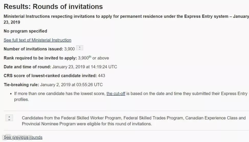 2019年1月23日加拿大移民快速通道 Express Entry 第109次甄选。 本次甄选共计发出3900份邀请函(ITA), 甄选分数为443分,分数略有回落。