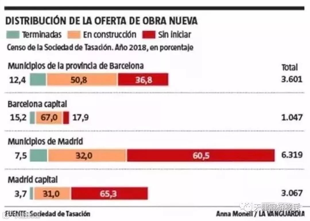 价值评估协会的住房调查报告显示,西班牙两大房地产市场,马德里和巴塞罗那,在近两年内新房库存量减少了90%。与之相对的是,西班牙的购房需求日益增长,想要新房就只能选择期房购买,很多房子甚至还没有开始建就已经被预购了。